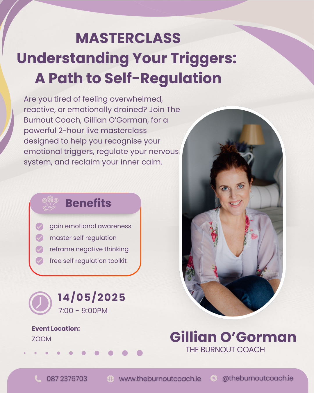 Are you feeling overwhelmed, reactive, or emotionally drained? Do you struggle with staying calm and collected in high-pressure situations? It’s time to take control of your emotional responses and reclaim your inner peace. Join Gillian O’Gorman, The Burnout Coach, for a transformative 2-hour live masterclass designed to help you understand your emotional triggers, regulate your nervous system, and build lasting resilience.